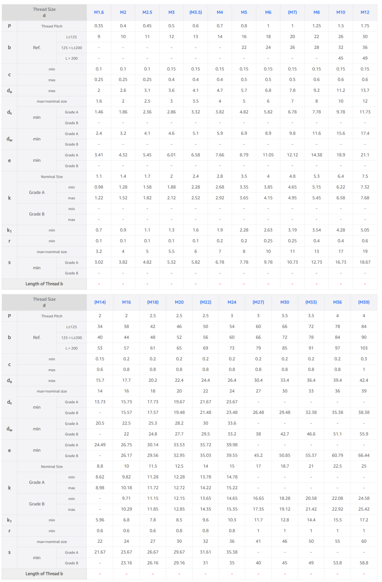 Hexagon Bolt Size Chart – ISO 4014 / DIN 931 Metric Dimensions