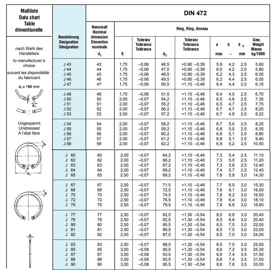 | DIN 472 | Internal circlips (retaining rings for bores) – metric series, nominal diameters 8mm to 950mm |