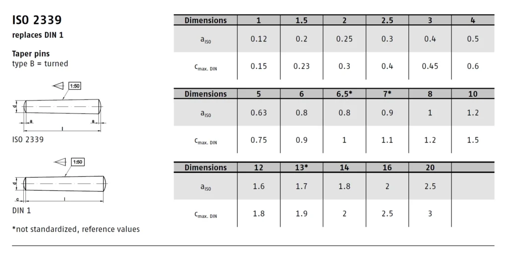 • DIN 1 – German standard for taper pins (dimensionally equivalent to ISO 2339)